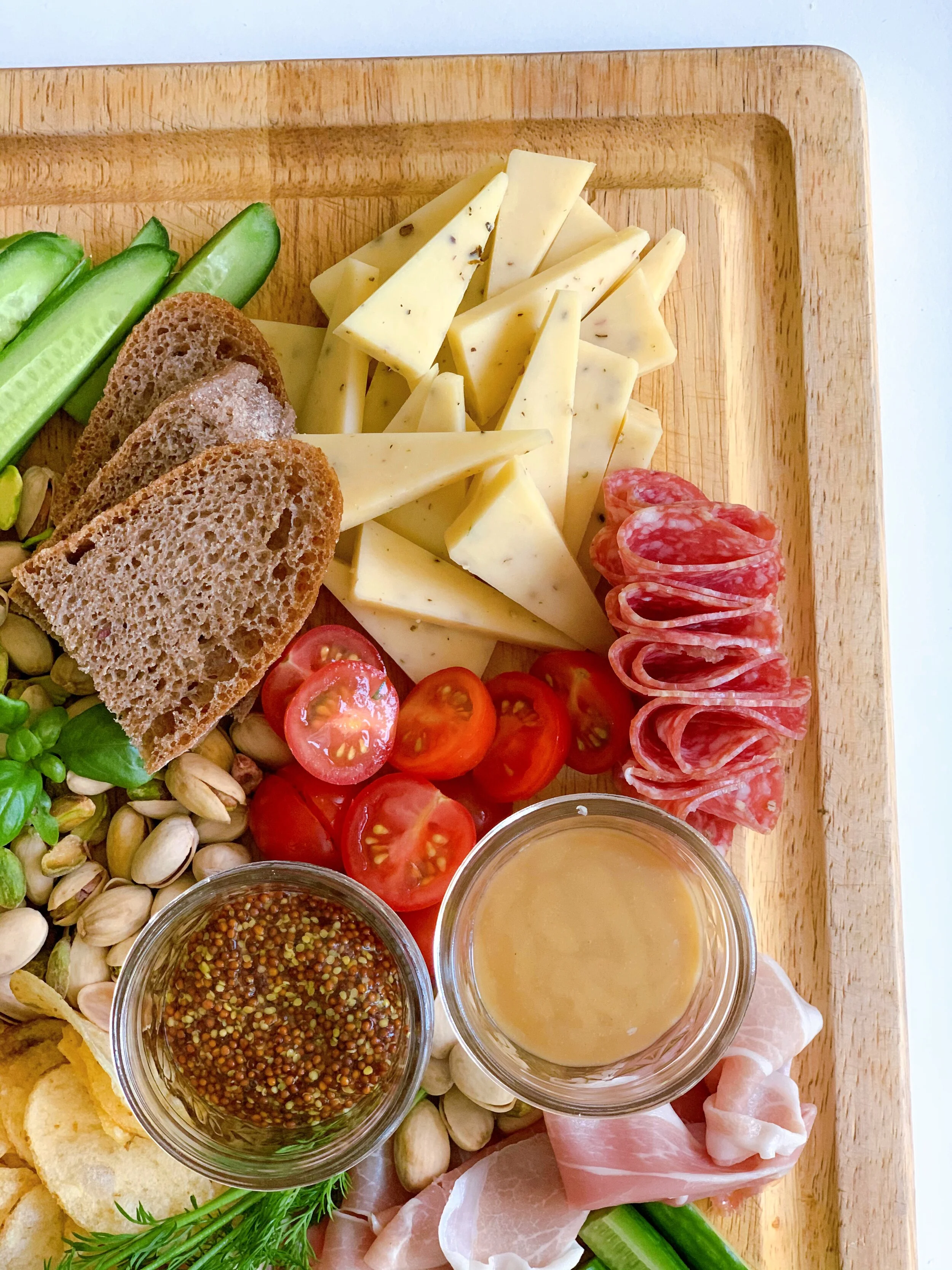 Lunch is probably my favorite meal of the day. Sandwiches, condiments, chips and beyond, it’s the perfect time to take a break from the work day and treat yourself. As an avid cheese lover, there are endless options to add to your sandwiches. So much so, that it’s worth just making a plate dedicated entirely to cheese. I teamed up with Cabot to highlight some delicious cheeses on a deconstructed sandwich plate. Cabot makes award-winning cheddars in a variety of ages and flavors. Their cheese is also super accessible, you can find it at most standard grocery stores. Their brand new packaging is inspired by the farmer’s award winning cheeses! For the cheese plate, choose your own sandwich adventure with an array of Cabot Cheese, meats and toppings! Perfect for leftovers after Thanksgiving, a game day lunch, or a small gathering with friends!